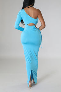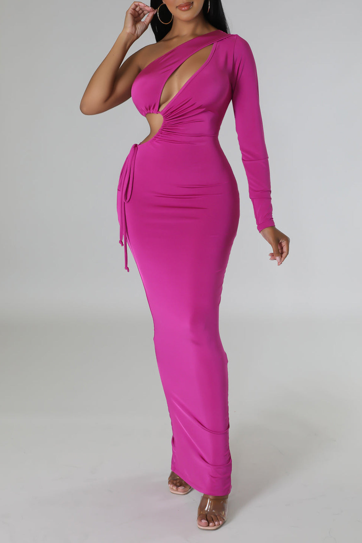 Stretch Dress, One Shoulder, Long Sleeve, Cutout, Slit, Self-Tie Closure.