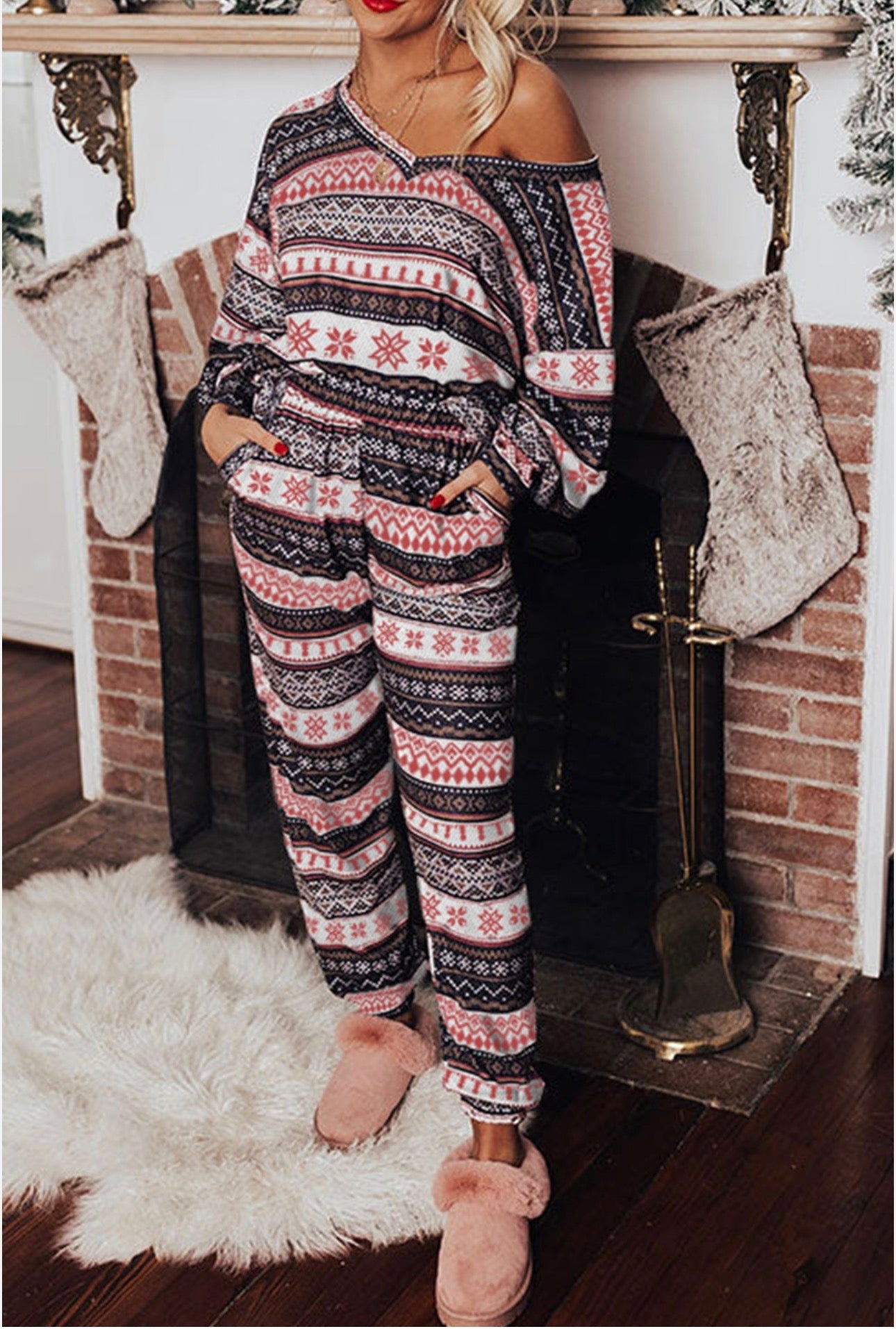 Christmas Pattern Loose Pullover 2pcs Lounge Pant Set