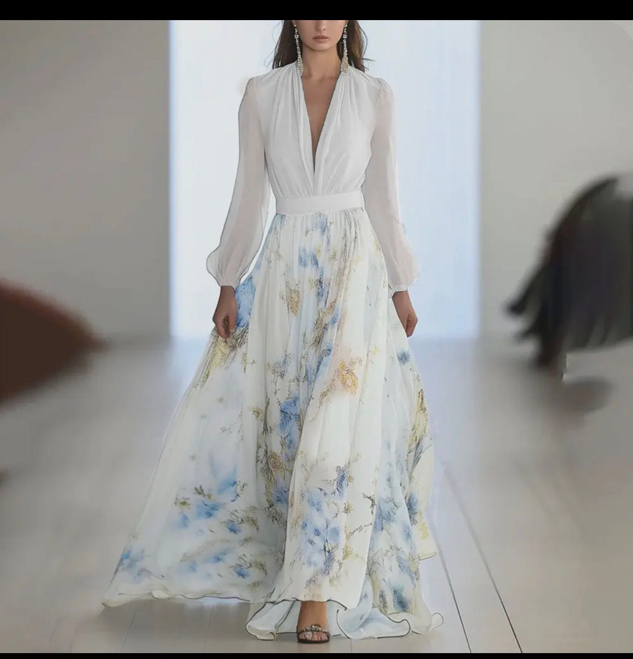 Women V neck puff sleeve statement print A- Line maxi dress