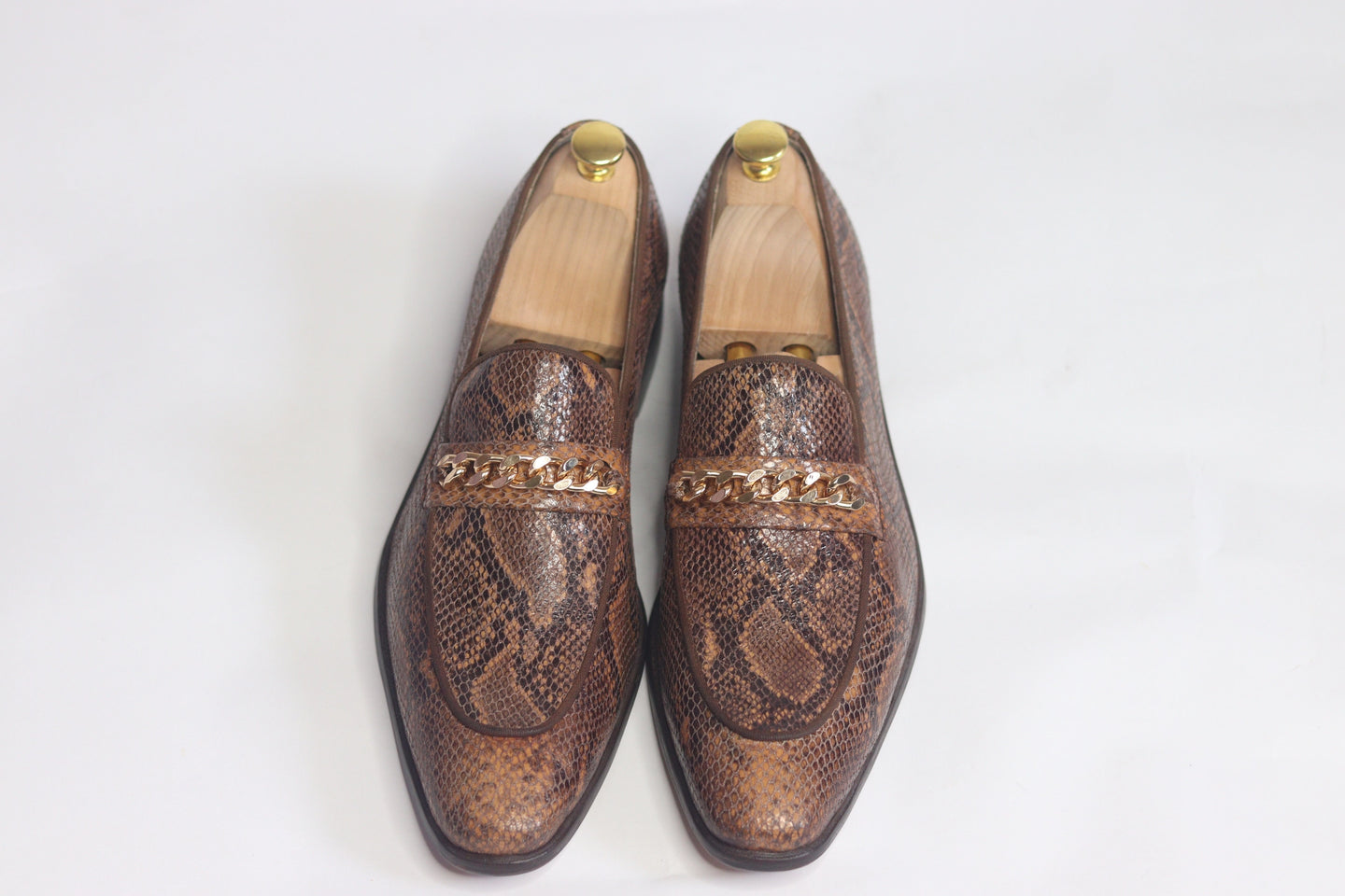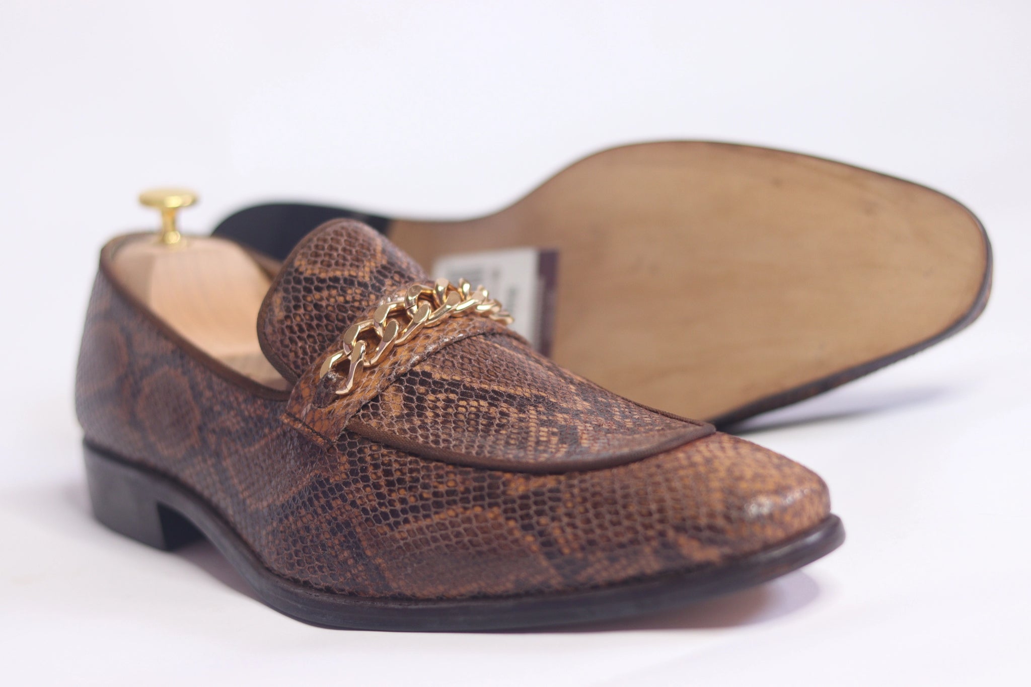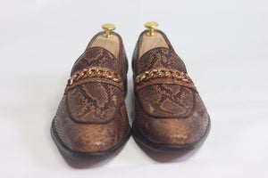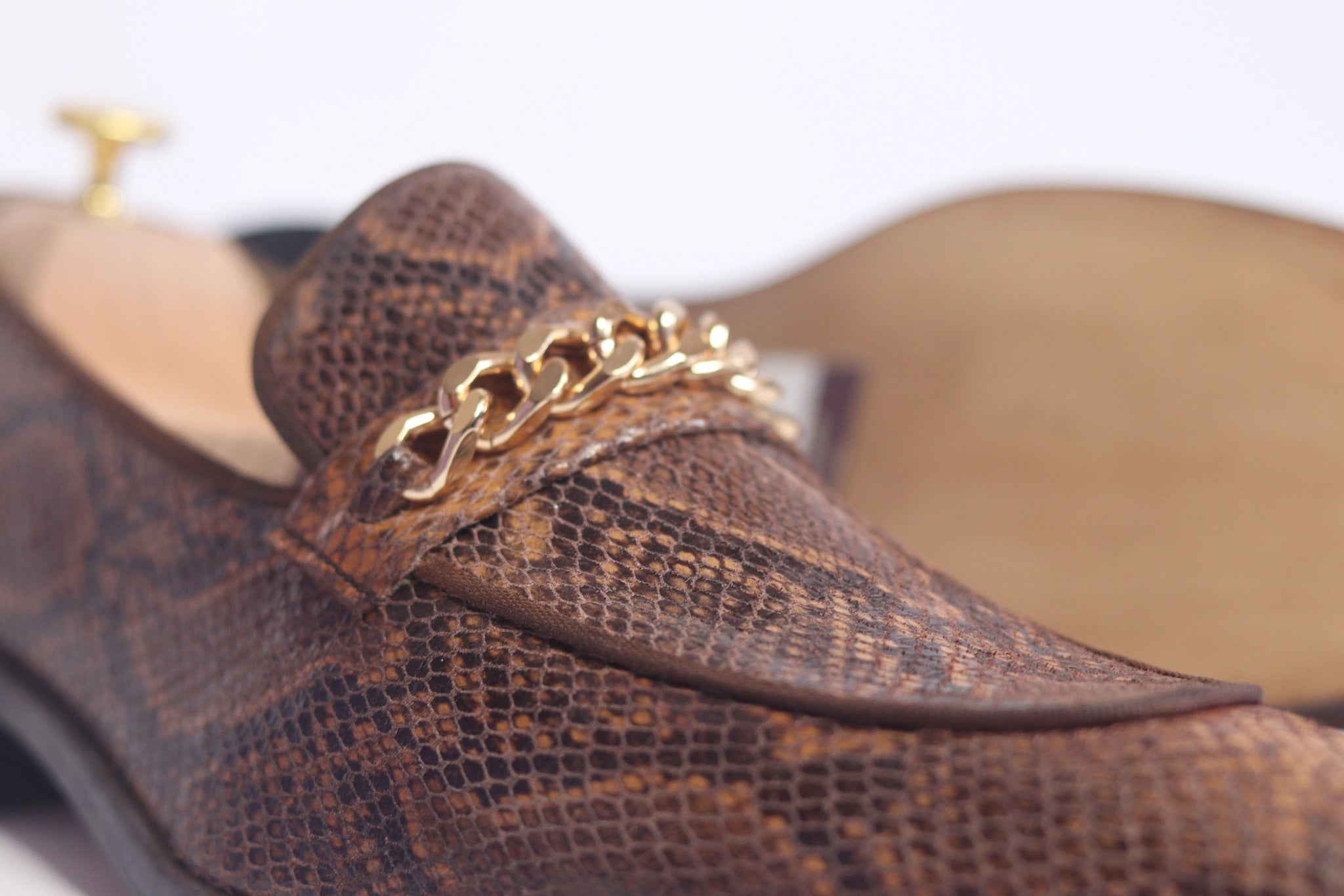 The Satire corporate shoe is an exquisite footwear option for men who value both comfort and style. Made from genuine leather with a snake print, this shoe boasts a classic thong design and a chain ornament that ensures a secure fit. The memory foam insole guarantees all-day comfort, making it perfect for any occasion. Features Upper - Authentic Leather with Snake Print Upper Design - Classic Thong Upper Color - Brown (with patches of black) Buckle - Chain Ornament Inner Lining - Cow Skin Balance & Comfort - Memory Foam Insole Bottom Shoe Sole - Thick Leather Hide