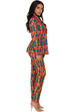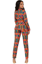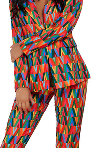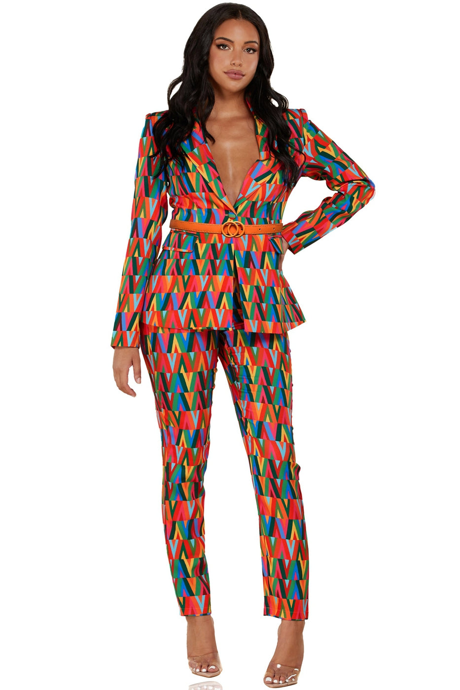 Rainbow Orange Print Two-Piece Pant Set Features A Single Button Front Blazer In A Form Fitting Shape And Slip-On Narrow Leg Pants With An Elastic Back Waistband And Pockets.