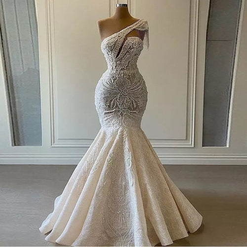One Shoulder Mermaid Wedding Dresses Beaded Crystal Lace Applique Tassel Bridal Gown for Wedding Party vestidos de novia