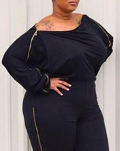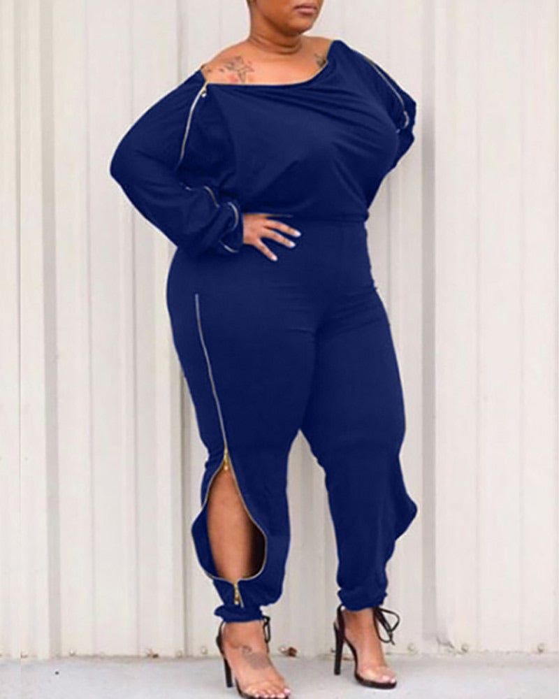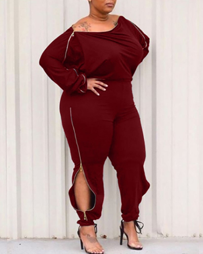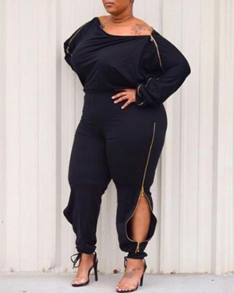 Plus Size Plain Zipper Design Top & Tie Detail Pants Set