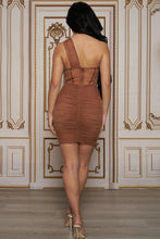 RHINESTONE RUCHED ONE SHOULDER MINI DRESS