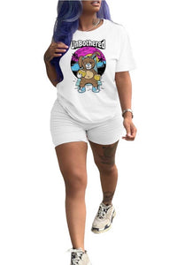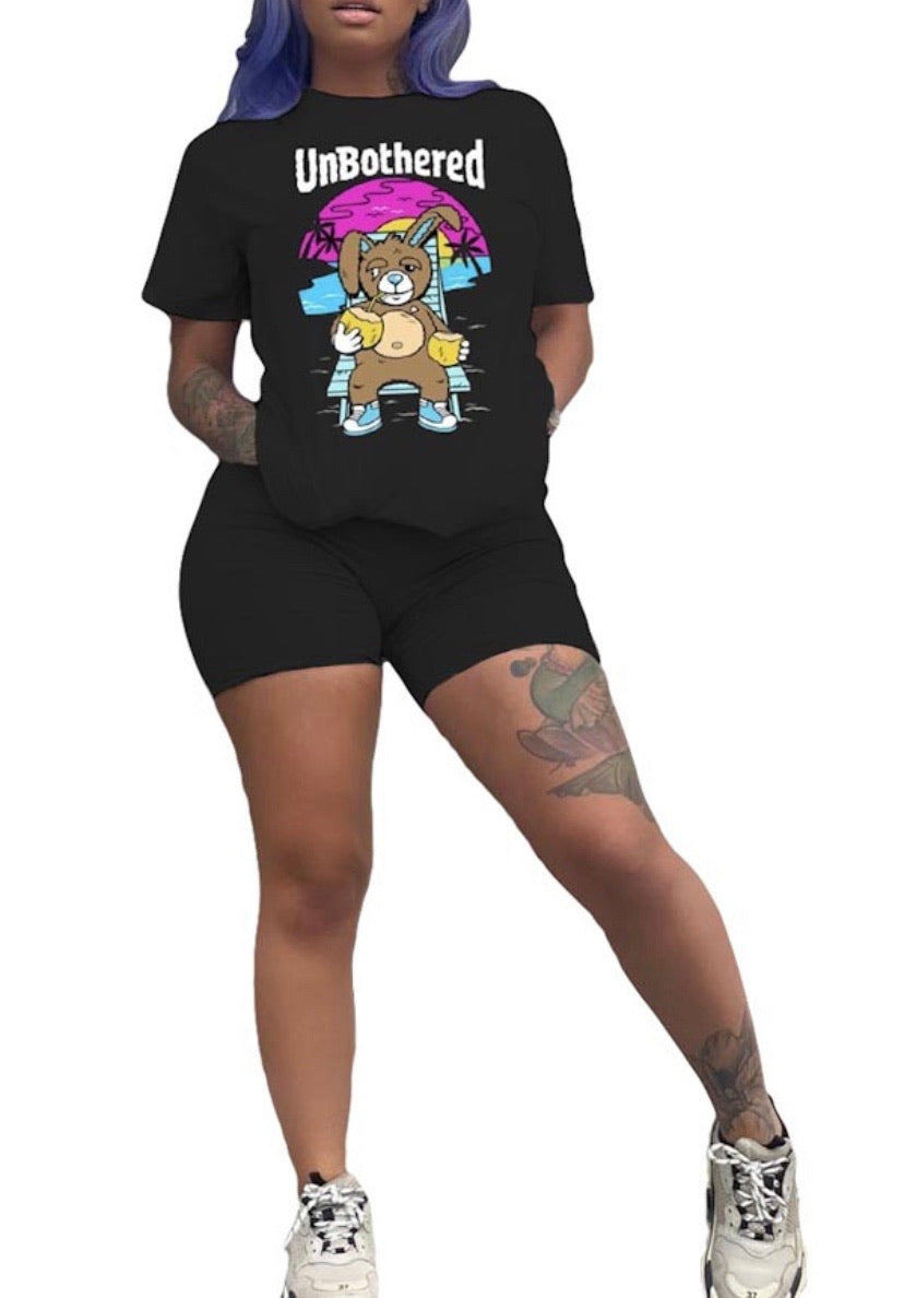 This 2 piece short set features a "UNBOTHERED" bunny design over a solid color base. Short sleeve top, above the knee biker shorts. Content: Poly Blend Width & Length Measurement in cm approx: Model Info: Height: 5ft 9in | Waist: 25in | Hips: 37in | Chest: 34D Wear Size: Medium Material Feeling: - Softness: Medium -Stretchy: yes -