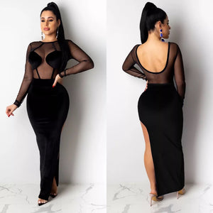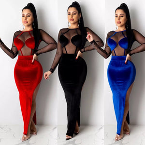 Women 2020 Spring Winter Long Maxi Dress Mesh Patchwork Full Sleeve Velvet Dress Sexy Night Club Party Bandage Bodycon Dresses